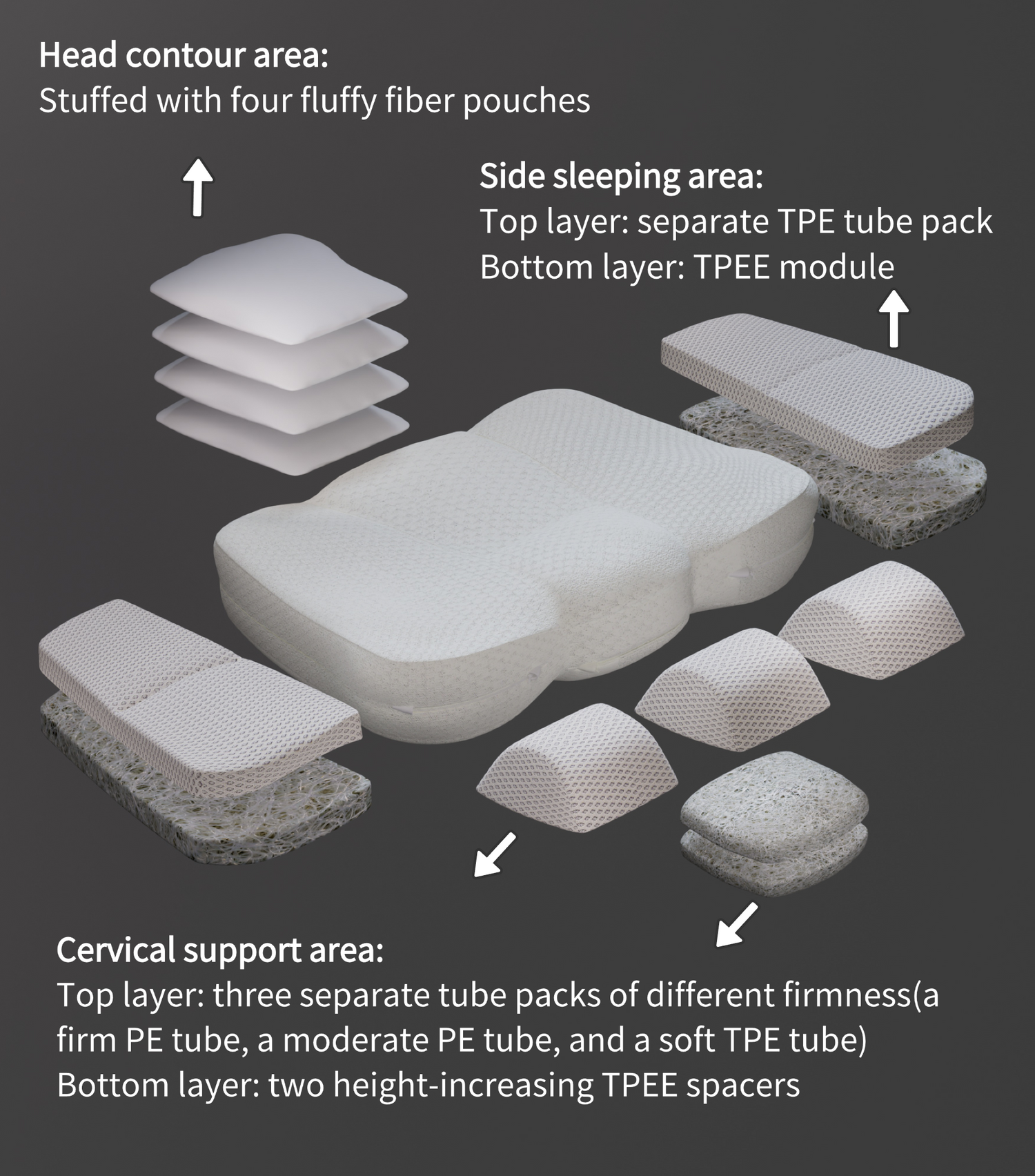 This cervical neck pillow has two layers, each layer is divided into four areas: a cervical support area, a head contour area, and two side-sleeping areas.